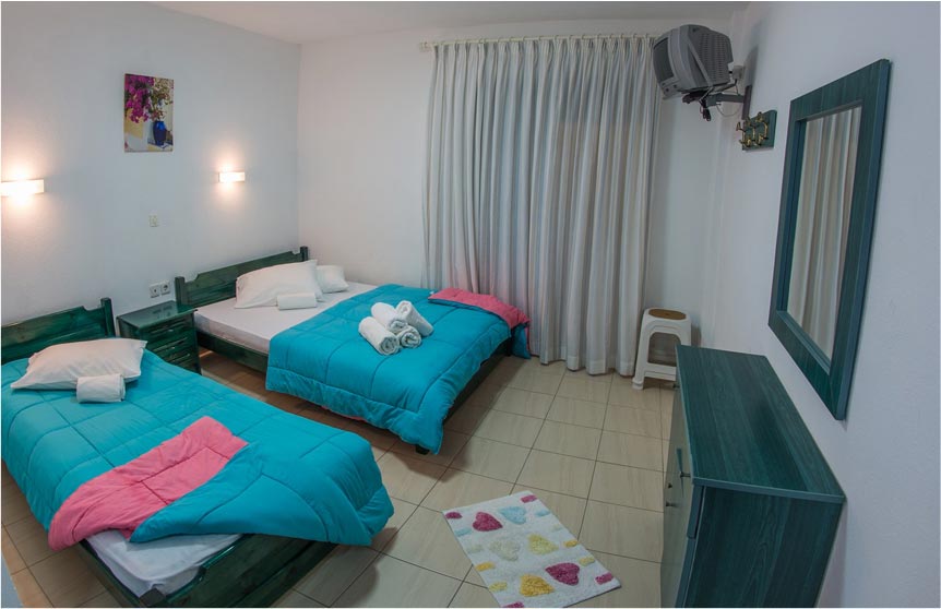 The room has a double and single bed, free wi-fi, TV Set, Air Condition, WC, Fridge, Cooker with two hobs fully equiped with cookware.