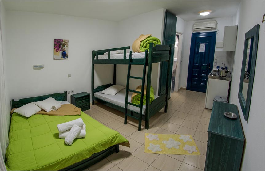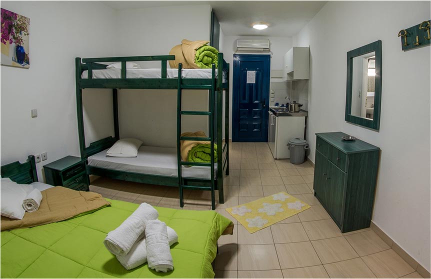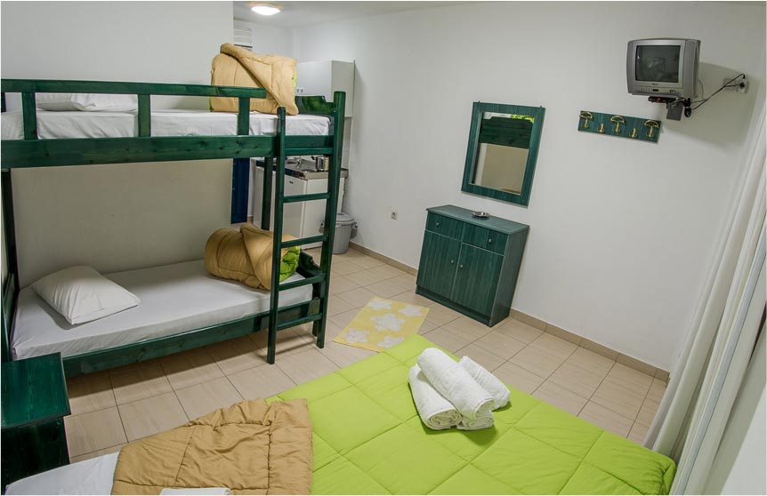 The room has one double bed and two single beds in bunk style, free wi-fi, TV set, Air Condition, WC, fridge, cooker with two hobs fully equiped with cookware.