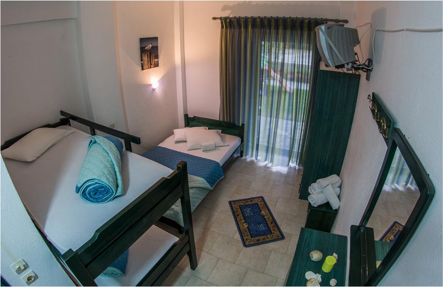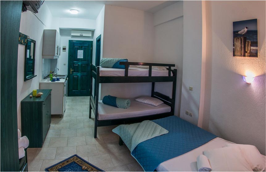 Το δωμάτιο περιλαμβάνει ένα ημίδιπλο και δύο μονά κρεβάτια ( τα δύο μονά κρεβάτια είναι σε στυλ κουκέτας) , δωρεάν Wi-Fi , TV ( Greek ) , Air Condition , WC , Ψυγείο με μικρή κατάψυξη , κουζίνα με δύο μαγειρικές εστίες , πλήρως εξοπλισμένη με μαγειρικά σκεύη.