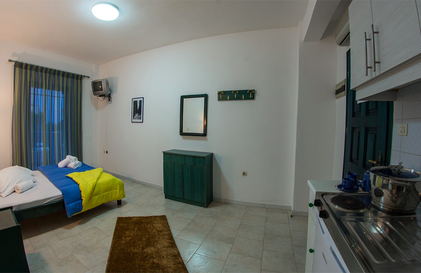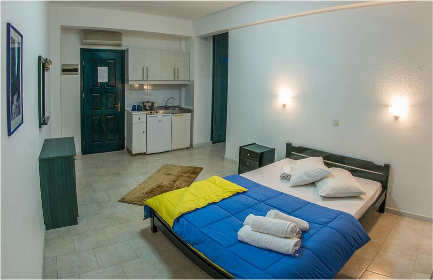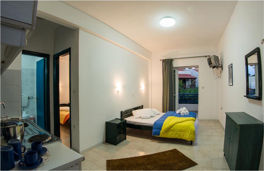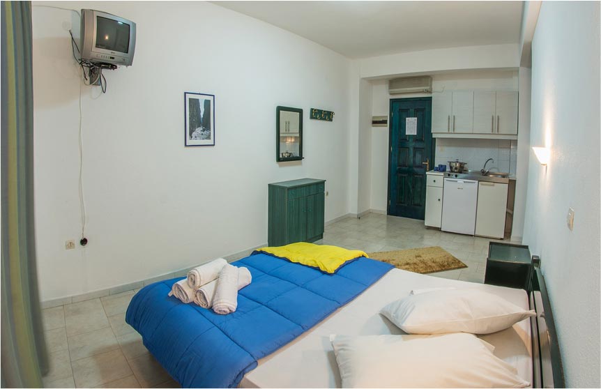 Στον κύριο χώρο του διαμερίσματος υπάρχει ένα διπλό κρεβάτι καθώς επίσης: Air Condition , TV ( Greek ) , WC , Ψυγείο με μικρή κατάψυξη , κουζίνα με δύο μαγειρικές εστίες , πλήρως εξοπλισμένη με μαγειρικά σκεύη.