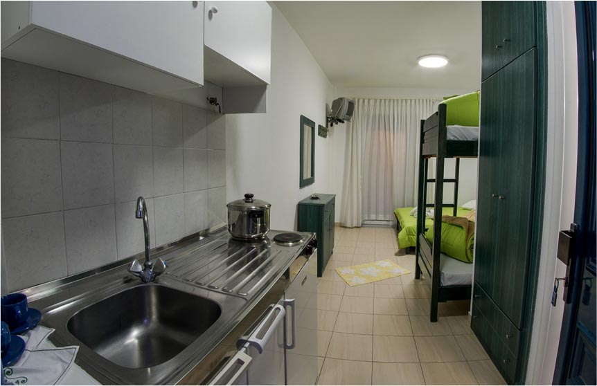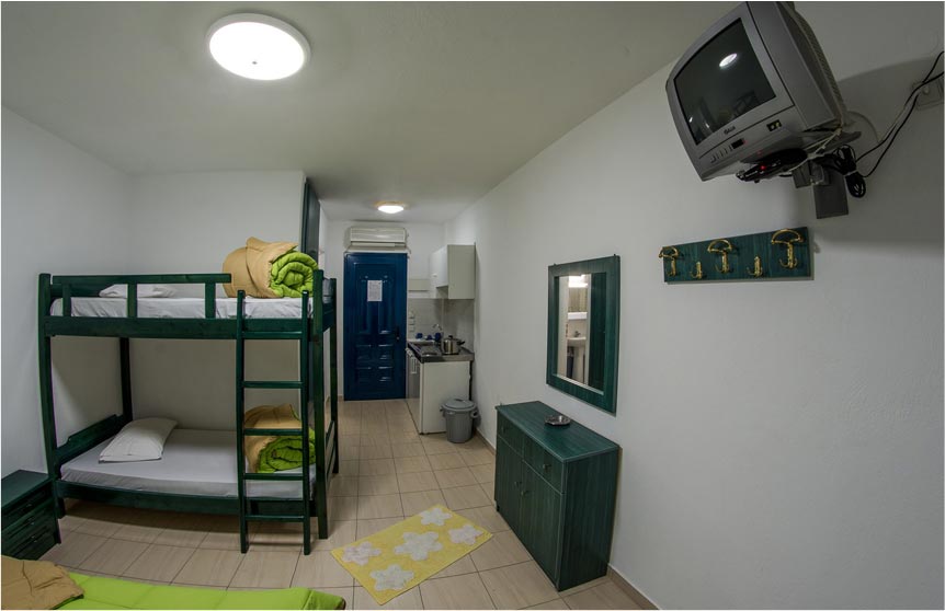 Το δωμάτιο περιλαμβάνει ένα διπλό και δύο μονά κρεβάτια ( τα δύο μονά κρεβάτια είναι σε στυλ κουκέτας) , δωρεάν Wi-Fi , TV ( Greek ) , Air Condition , WC , Ψυγείο με μικρή κατάψυξη , κουζίνα με δύο μαγειρικές εστίες , πλήρως εξοπλισμένη με μαγειρικά σκεύη.